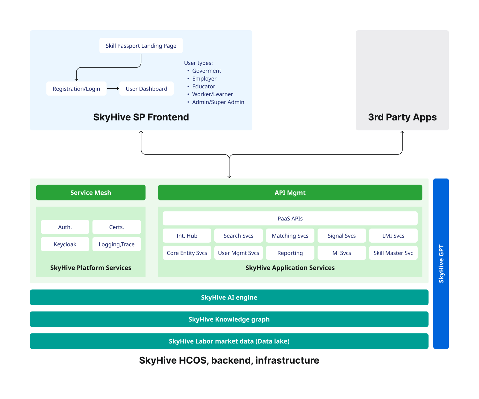 At its foundation, the Skill Passport is powered by SkyHive's Human Capital Operating System (HCOS), also known as SkyHive 'Vertical Cloud'. This sophisticated backend infrastructure enables real-time processing and analysis of extensive data sets at scale.