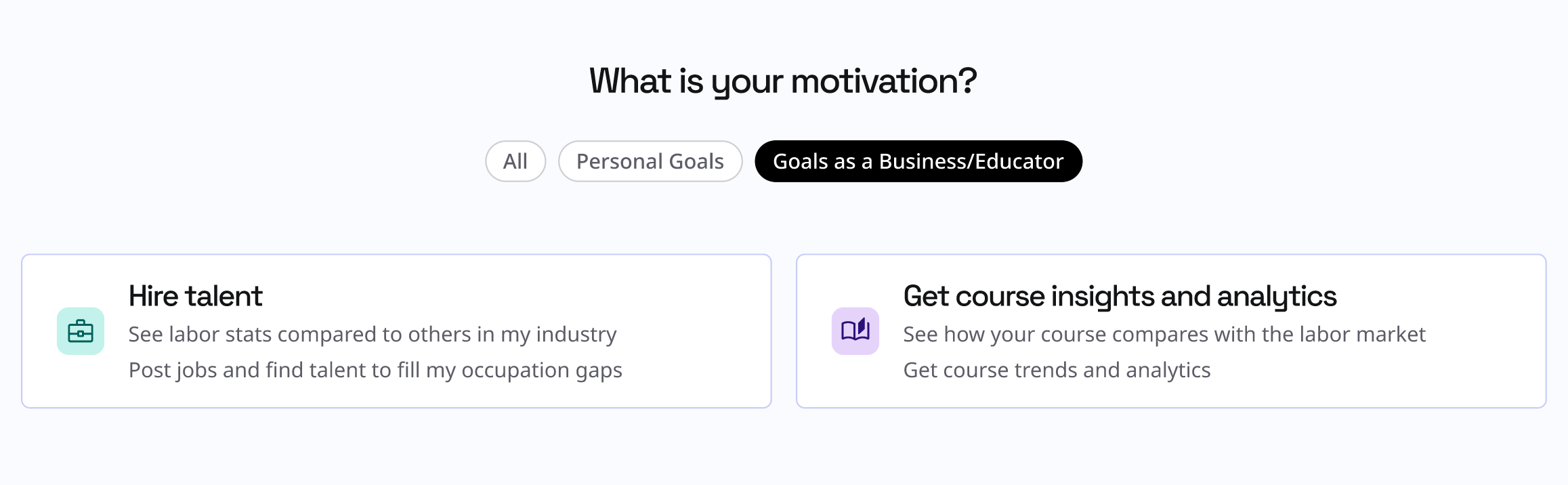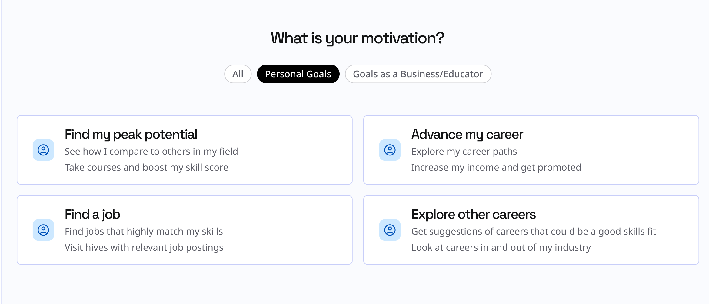 Each tile on this dashboard represents a different motivation or goal. Click on a tile to explore more about that area or set specific objectives.