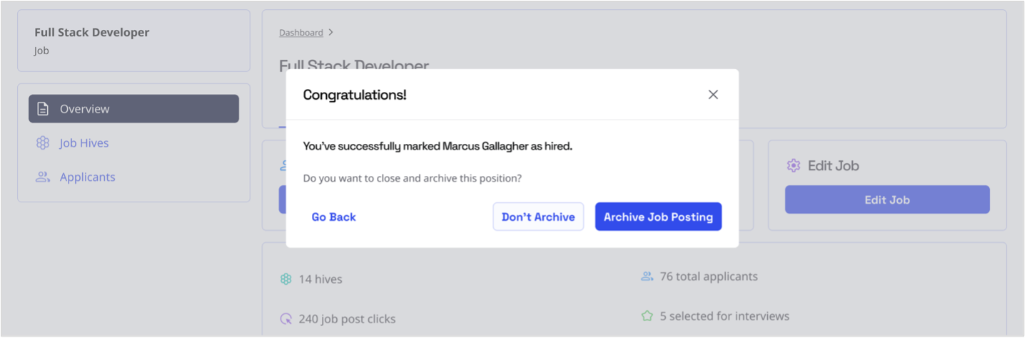 When ready to hire, click 'Mark as Hired' to choose between: